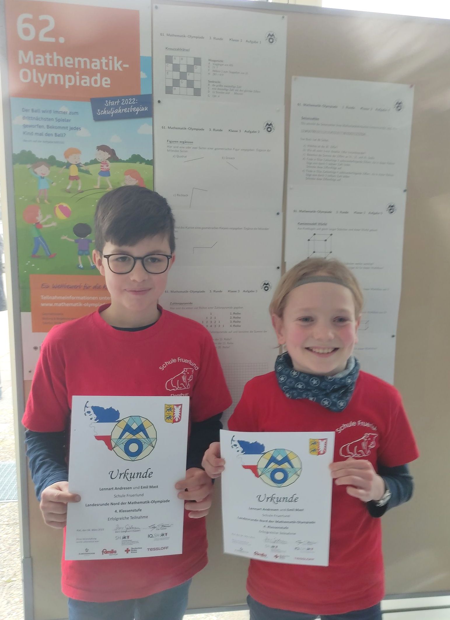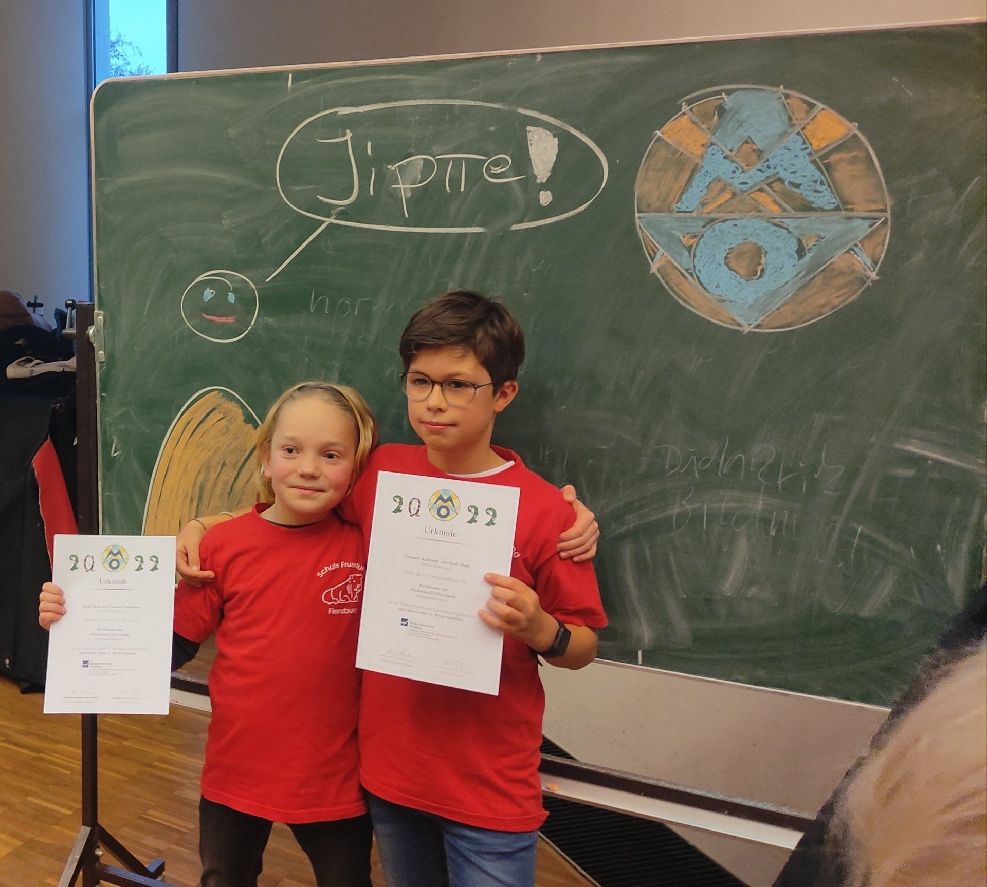 Am letzten Freitag konnten sich unsere zwei Mathe-Asse aus Klasse 4, Lennart Andresen und Emil Mast, den 1. Platz bei der Kreisrunde der Mathe-Olympiade sichern. Bei der anschließenden Siegerehrung wurde es dann richtig spannend. Je länger es dauerte, umso aufregender wurde es für die zwei. Vor ihnen wurden 70 andere Teams aufgerufen. Im Februar/März geht es dann weiter nach Kiel zur Landesrunde.