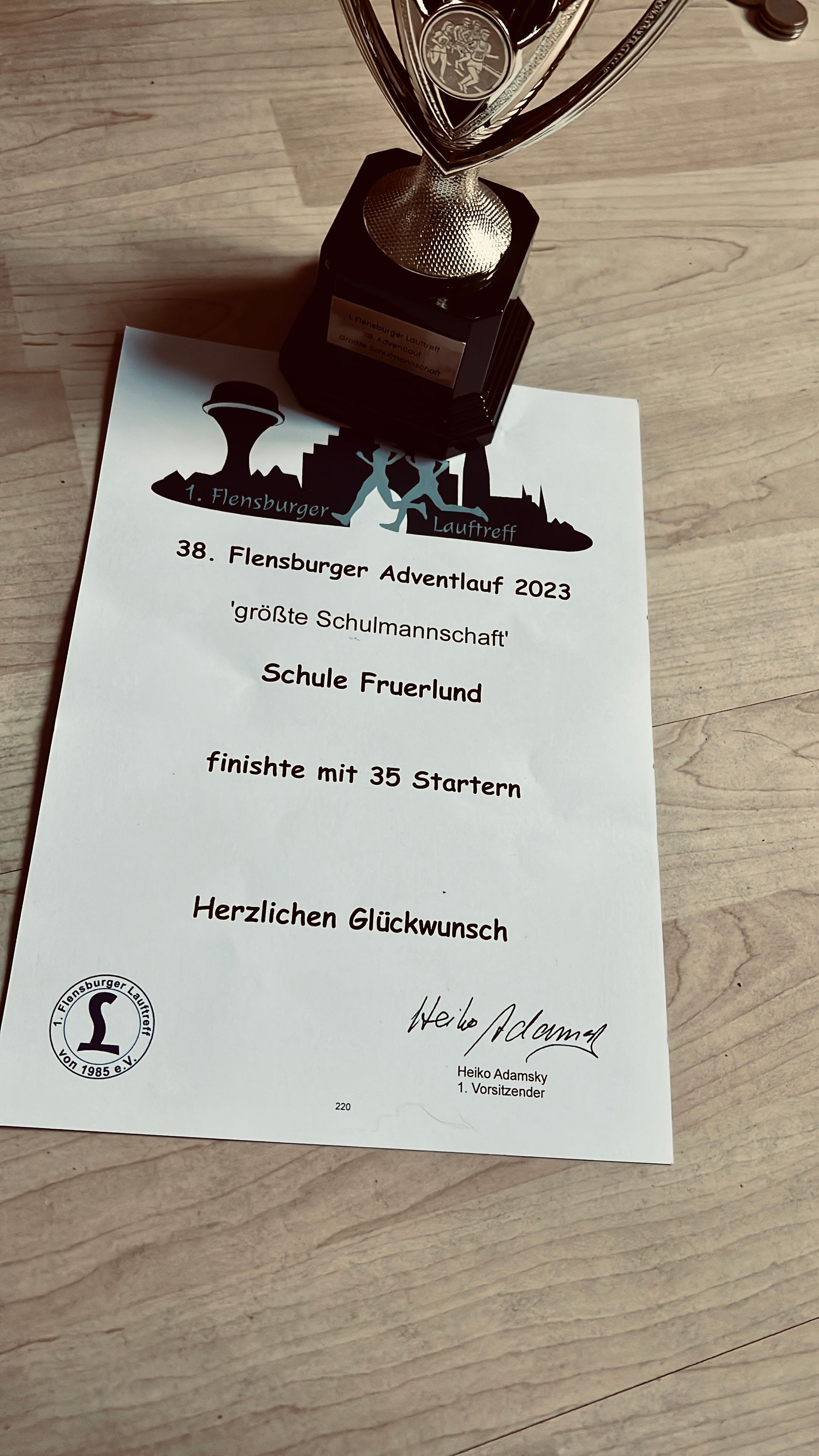 Alle Jahre wieder steht der Adventslauf in Flensburg an. Auch in diesem Jahr haben wir es wieder geschafft, die teilnehmerstärkste Schule beim Adventslauf zu werden. Mit insgesamt 45 Finishern konnten wir uns diesen einzigartigen Pokal, der extra für diese Veranstaltung gefertigt wurde, sichern. Auf allen Strecken konnten unsere Läuferinnen und Läufer tolle Zeiten und persönliche Bestleistungen erzielen. Schulhund Anoki war zum Anfeuern dabei, das Laufen hat er den anderen überlassen. Wir freuen uns schon aufs nächste Jahr.
