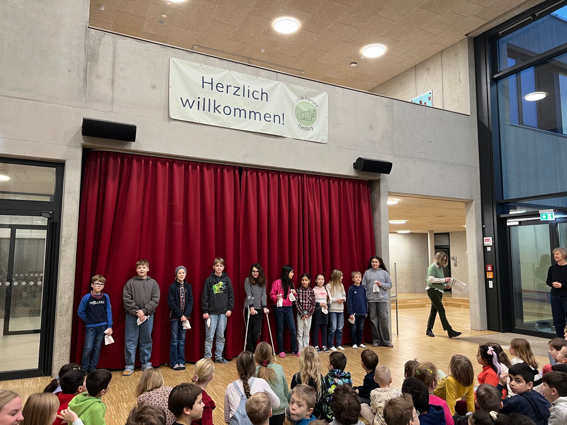 Mit einem Frühlingsfest wurde am Montag der Frühling in der neuen Aula der Schule Fruerlund begrüßt. Es gab Gedichte, Tänze und Musik, sogar Selbstgeschriebenes. Moderiert und unterstützt wurde die Veranstaltung von unseren Musikkolleginnen Frau Taube und Frau Kleine. Endlich kann diese tolle Tradition fortgesetzt werden.