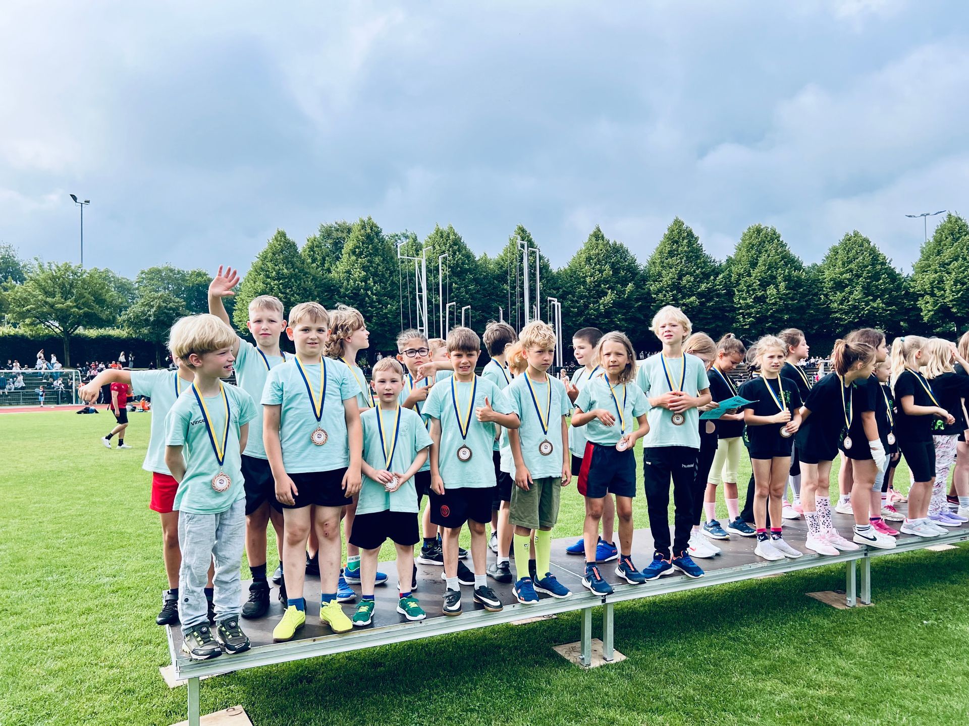 Auch in diesem Jahr haben wir wieder mit 4 Mannschaften am Staffeltag teilgenommen und waren seit langer Zeit mal wieder ganz erfolgreich. Die Jungs 1/2 konnten sich in einem starken und spannenden Finale den 3. Platz ganz knapp erkämpfen und konnten eine Medaille mit nach Hause nehmen. Bei den Mädchen 1/2 lief es auch sehr gut. Sie verpassten den 3. Platz knapp und wurden 4. Die Mädchen 3/4 konnten ins Finale einziehen und sich dort einen guten 6. Platz erlaufen. Leider reichte es für die Jungs 3/4 nicht fürs Finale, sie konnten aber eine 7. Platz erlaufen. Luft nach oben ist also noch. Die gesamte Schule feuerte die Teams an und alle Kinder gaben ihr Bestes.