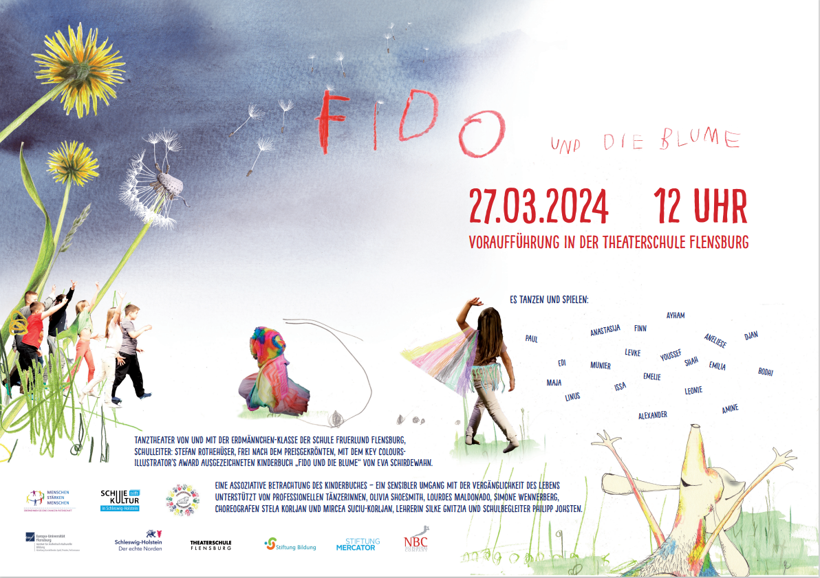 Am 27.03.2024 findet die Präsentation des TanzTheaters „Fido und die Blume“ um 12:00 Uhr in der Theaterschule Flensburg statt - von und mit der Erdmännchen-Klasse der Schule Fruerlund Flensburg, frei nach dem preisgekrönten, mit dem Key Colours-illustrator’s award ausgezeichneten, Kinderbuch „Fido und die Blume“ von Eva Schirdewahn.
